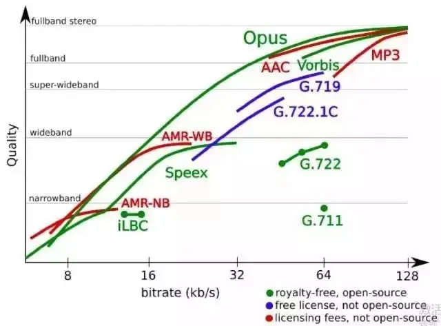 (2)从频带方面看,G.711、G.722、AMR和iLBC等标准适用于narrowband(8khz采样率)和wideband(16khz采样率)范围,针对普通的语音通话场景。AAC和MP3适用于fullband(48khz采样率)范围,针对特殊的音乐场景。而Opus适用于整个频带,可以进行最大范围的动态调节,适用范围最广。