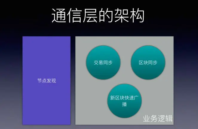第三层是通信层,通信层是节点之间交换信息的方式,包含区块同步,交易同步等。