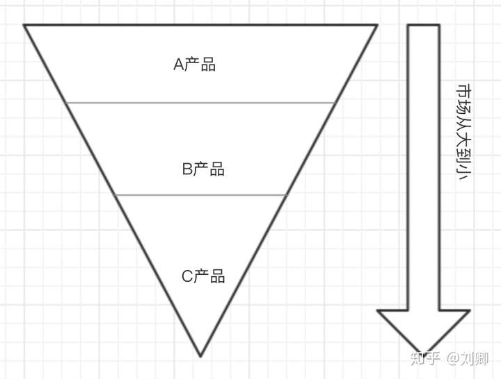 众荟这面的产品漏斗是通过市场需求量来划分的,越上层的产品专业度越低,相对应的人群也更大,我负责的2条产品线其实也这样的划分标准。下面是个示意,公司的漏斗比这个多。