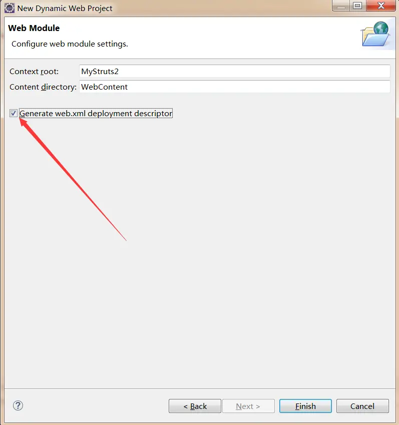 在Eclipse下进行新建项目,这里需要注意和MyEclipse的区别,勾选添加web.xml的选项,如下图所示。