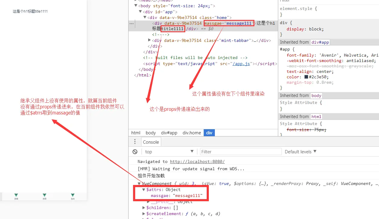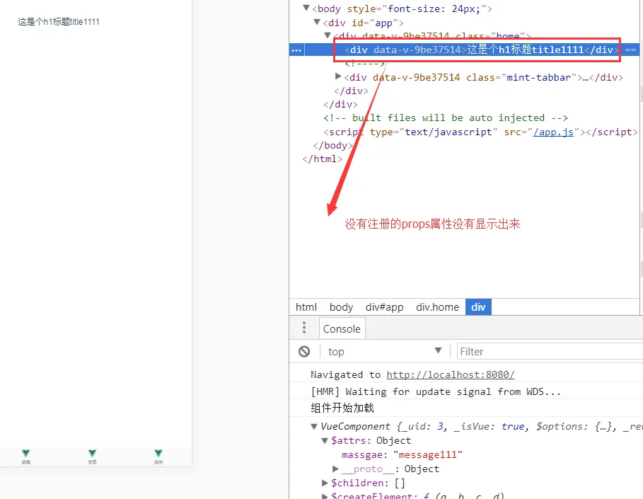 上边的代码,我们在组件里只是用了title这个属性,massgae属性我么是没有用的,那么下浏览器渲染出来是什么样呢?如下图:
