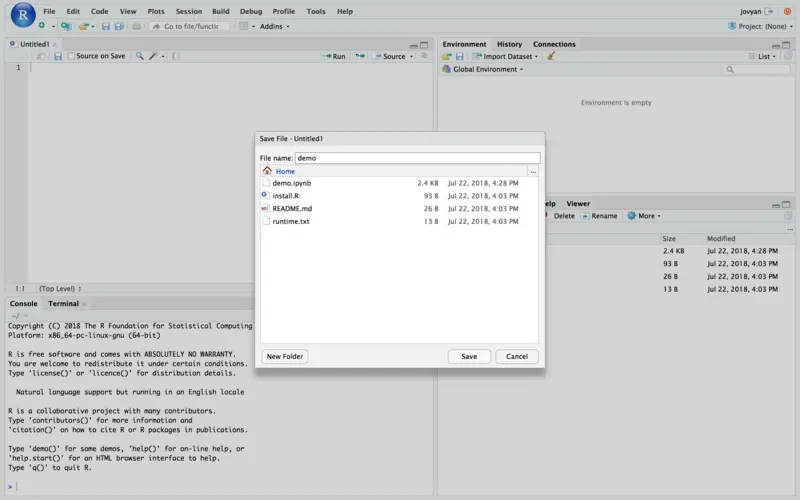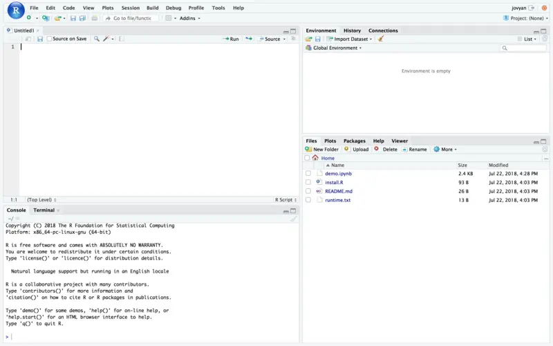 等准备工作完毕,你会看到,浏览器里面开启了一个 RStudio 界面。