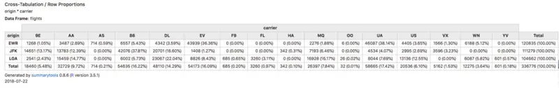 它还可以进行变量之间的关系展示。例如你想知道3大机场起飞的航班,对应航空公司的比例是否有差别。可以用一条语句,就得到这样的一张分析表格: