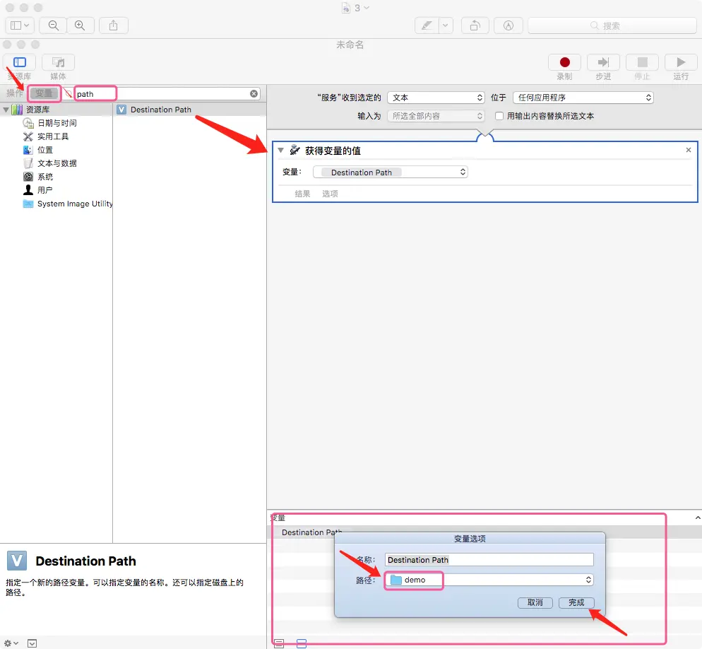 变量“,在搜索框中输入“path“,拖拽到中间区域. - 在下方“