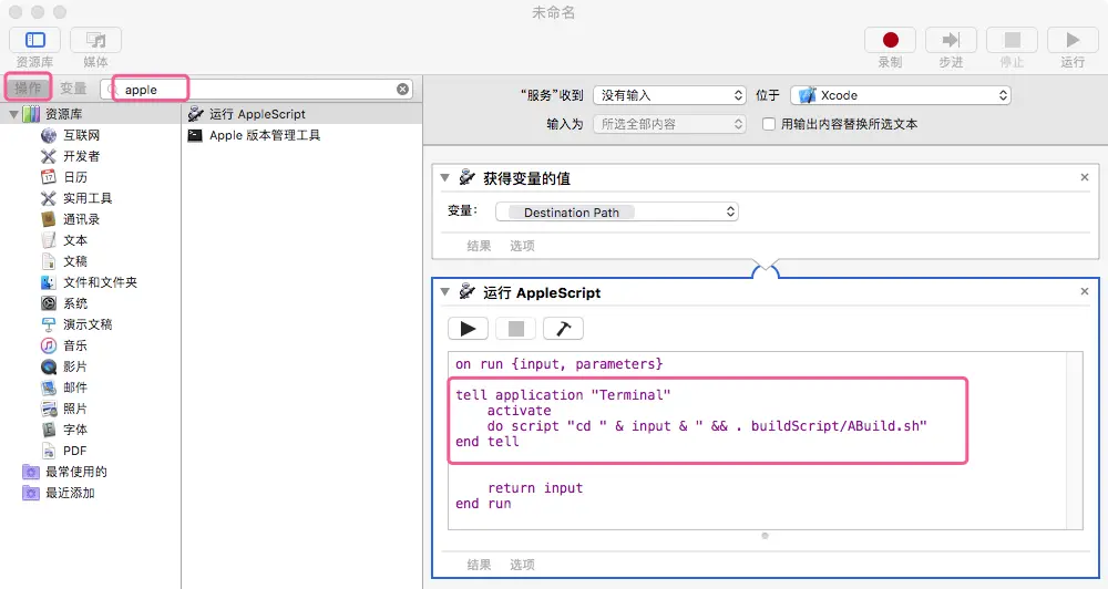 tell application "Terminal" activate do script "cd " & input & " && . buildScript/ABuild.sh" end tell - Automator应用界面左侧,点击“