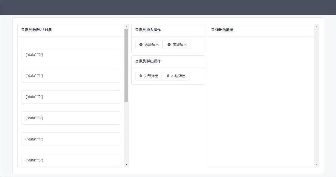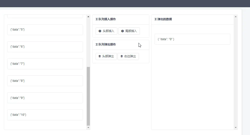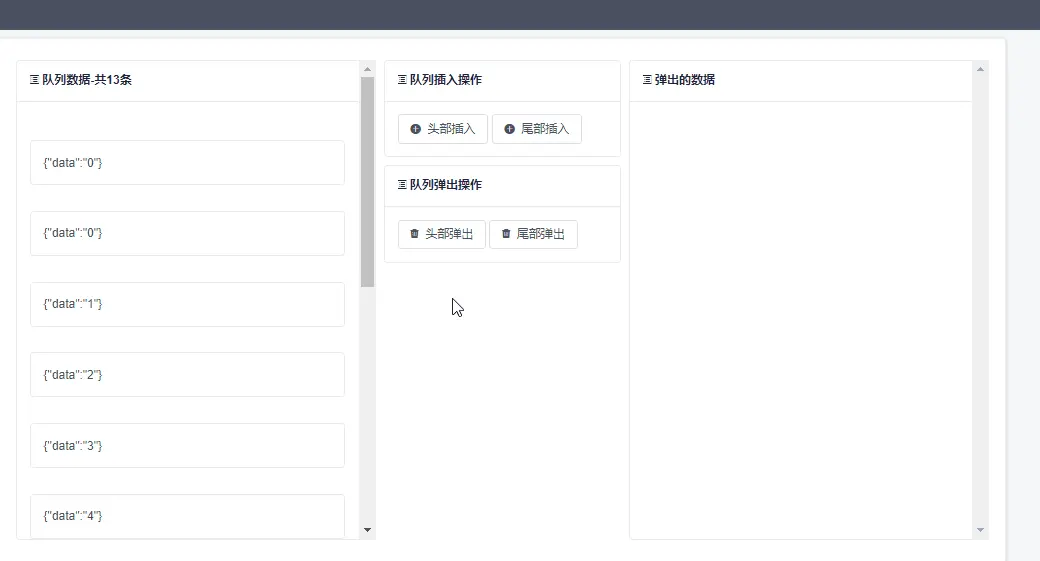 接下来看看尾部弹出的功能,点击下图中尾部弹出按钮,可以看到左边的队列尾部数据减少了,在右边弹出的数据出现了左边队列数据消失的数据。