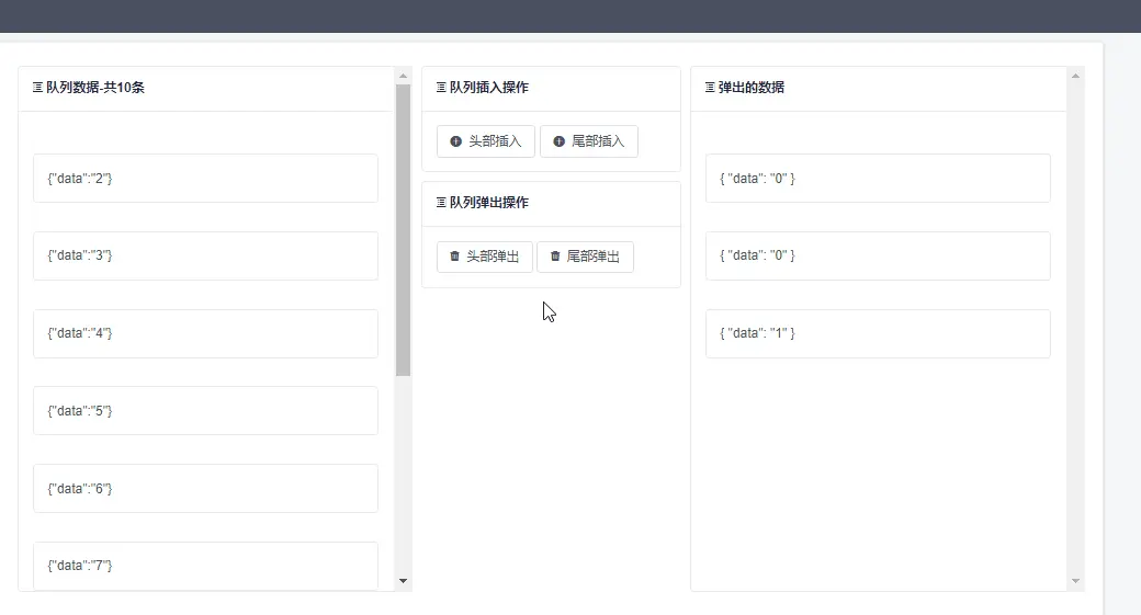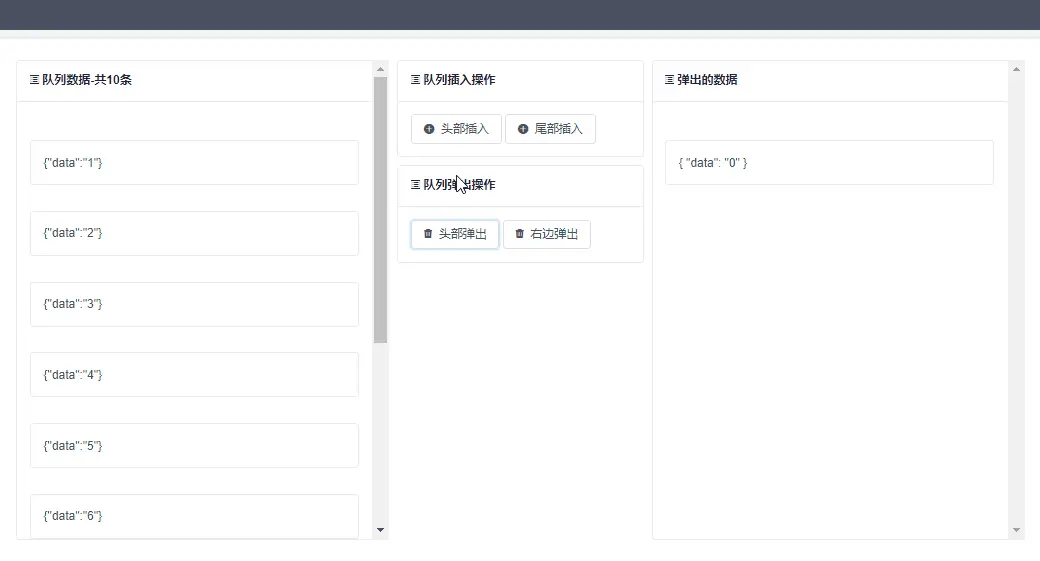 接下来看看头部弹出的功能,点击下图中头部弹出按钮,可以看到左边的队列顶部数据减少了,在右边弹出的数据出现了左边队列数据消失的数据。