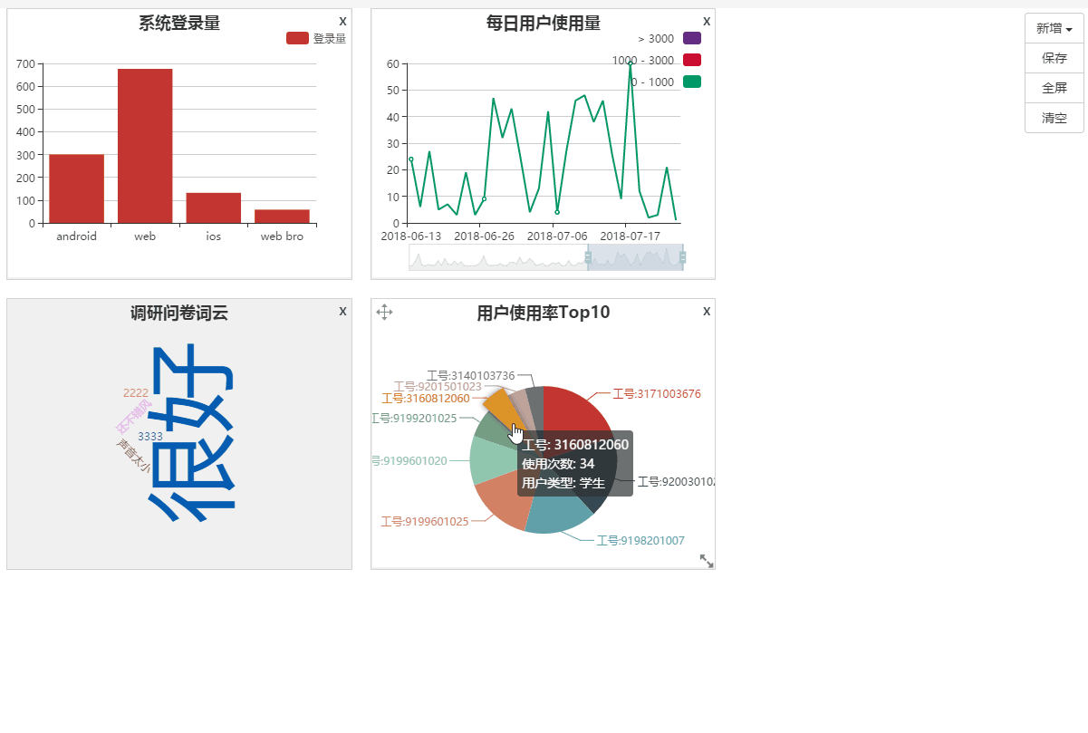 由于各个图表独立在iframe中,所以互不干扰,这使得我们可以把系统中各个图表都整合到这个仪表盘中。