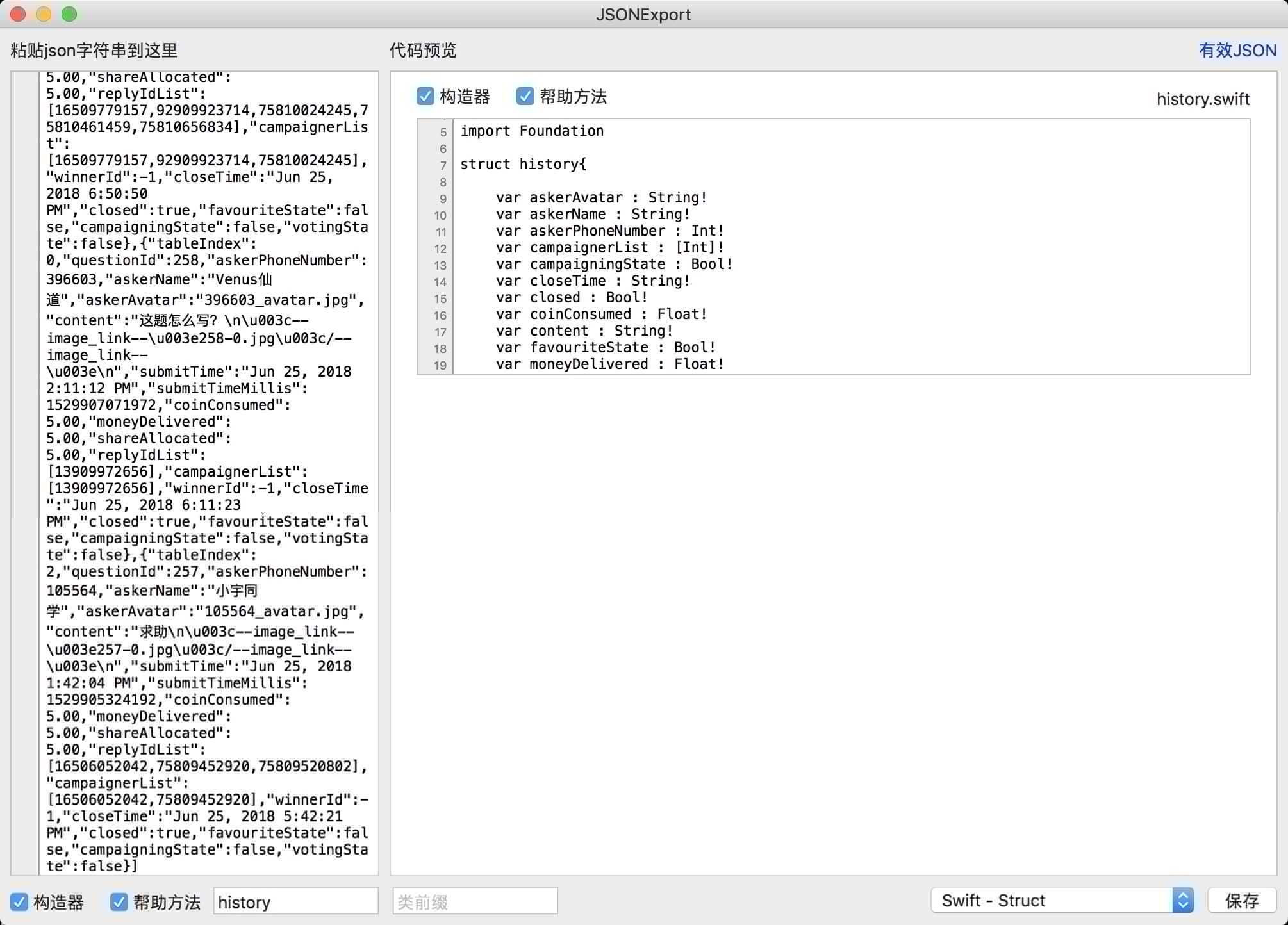 Struct和Class的生成可以借助第三方工具JSONExport完成,国内有人将其进行了汉化,可以很方便的导出我们所需要的Swift model文件。