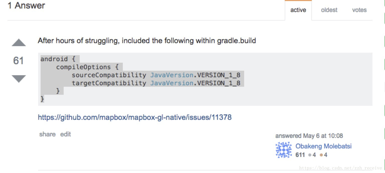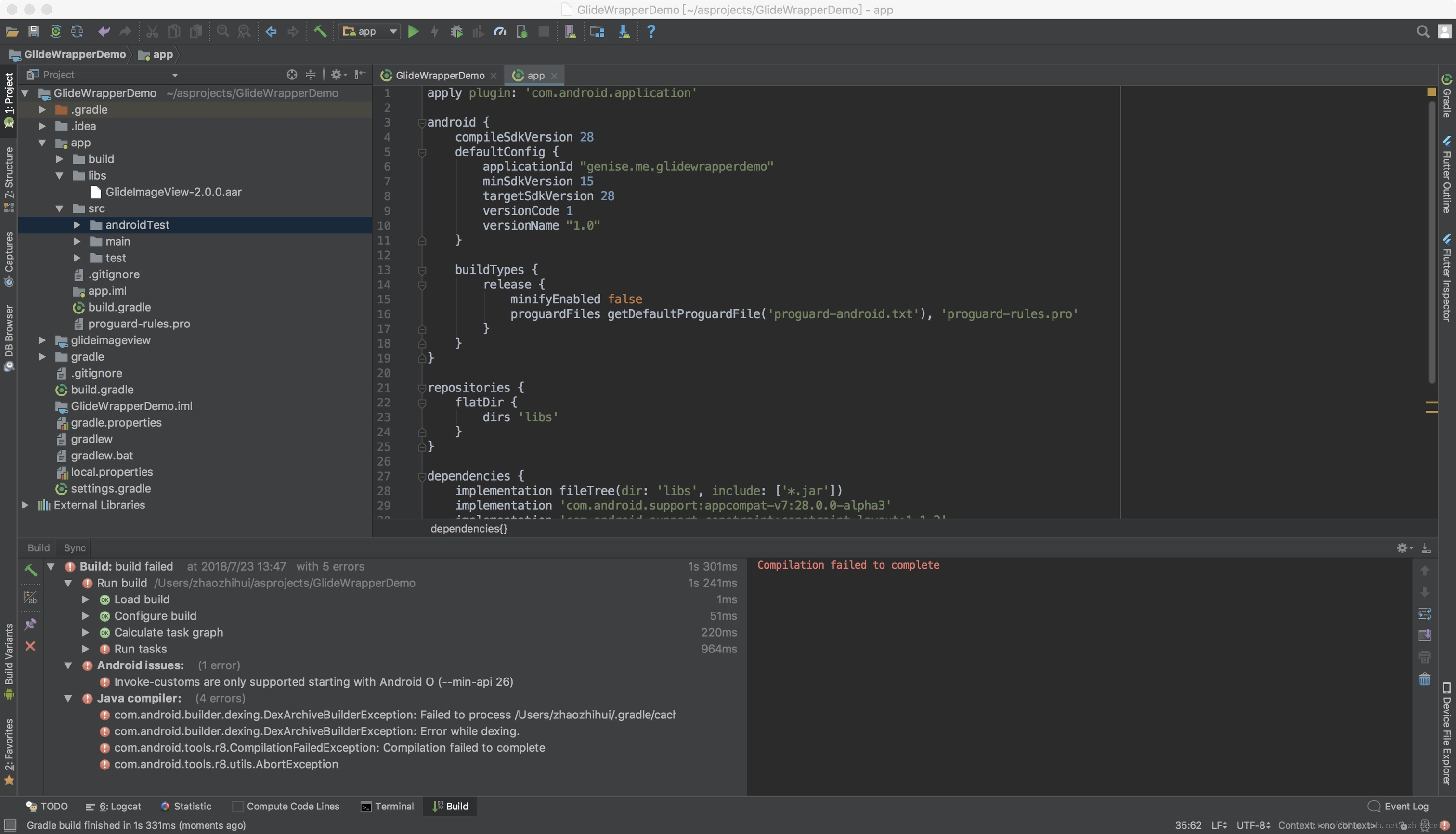 Invoke-customs are only supported starting with android 0 --min-api 26 Genise 2018-07-24 767 阅读1分钟 自从我把Android Studio SDK的版本升级到28以后,一直也没新建一个Project,今天新建Project突然发现一个问题然后在stackoverflow上面找到了解决的办法。在app下面的build.gradle添加代码如下图: