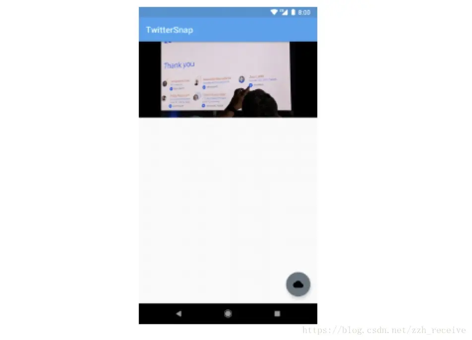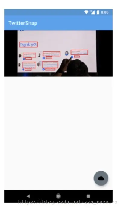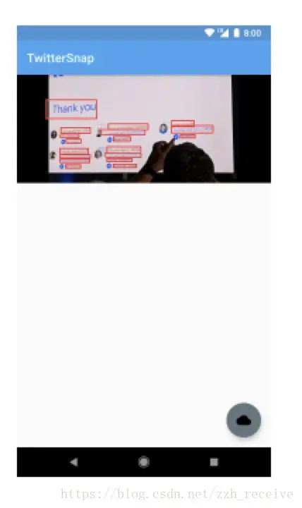 After you run the on-device text recognition, you may have noticed that the image on the FAB changes to a cloud icon. This is what you’ll tap to run the in-cloud text recognition. Time to make that button do some work!