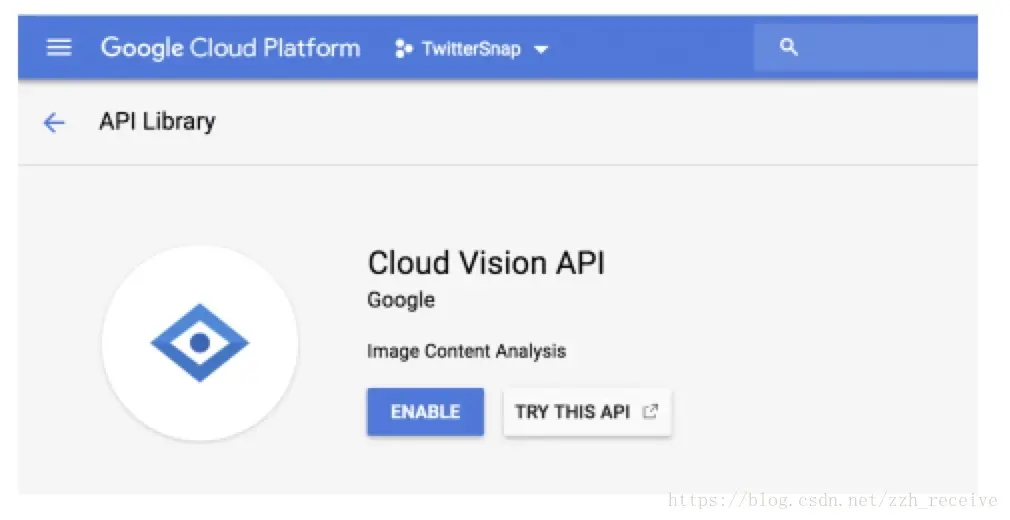 This takes you to the Cloud Vision API screen. Make sure to select your project at the top, and click the Enable button.