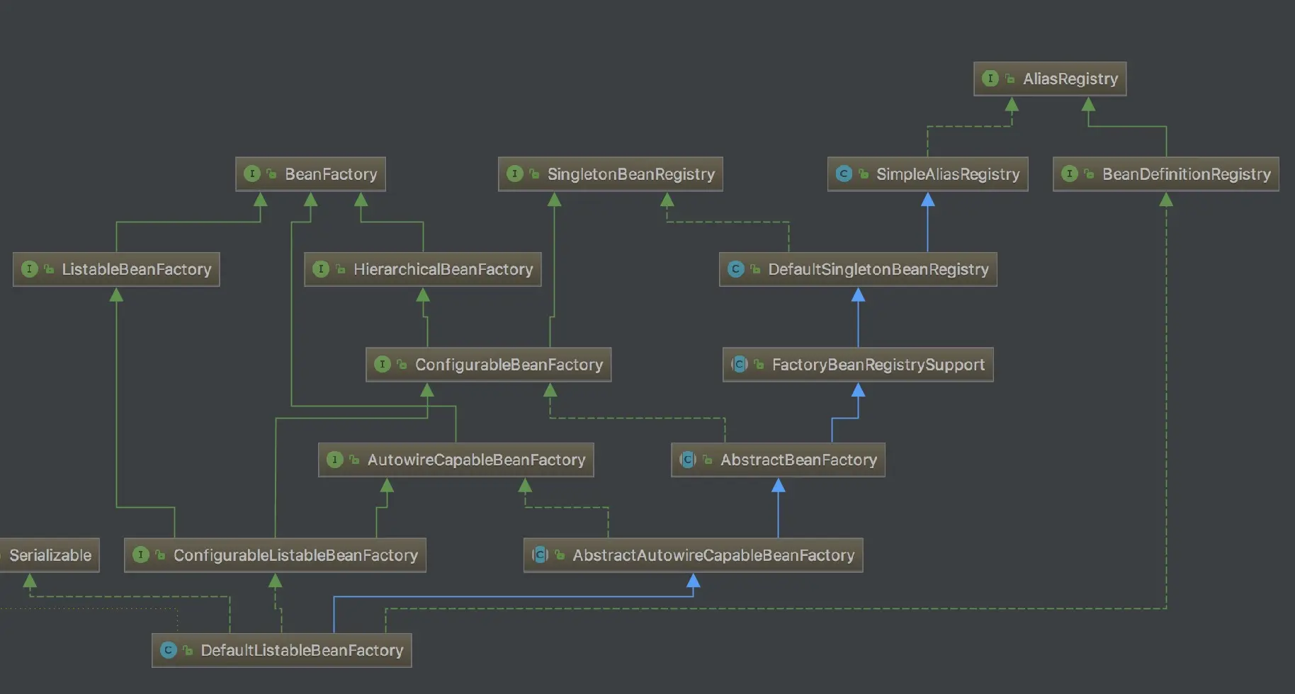 关于beanFactory的具体功能作用等,我们到用到时再深入了解,并且网上相关资料也较多,这里就不再详述,暂时只介绍其初始化过程干了什么。之前我们分析了,在ApplicationContext初始化过程中,调用了beanFactory的默认实现DefaultListableBeanFactory,下面是其继承体系图,简单了解一下。