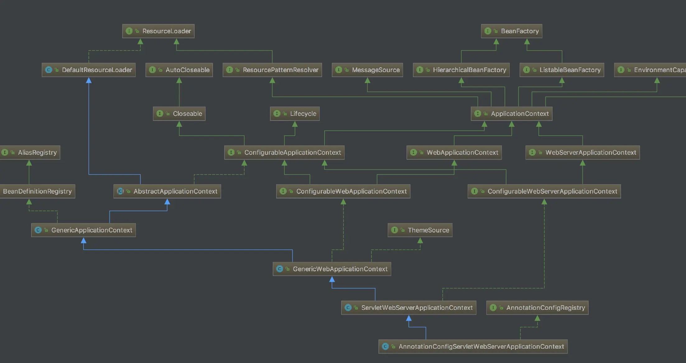至此,AnnotationConfigServletWebServerApplicationContext自身初始化干了什么我们都知道了。而且也能猜到,上面两个类就是实现了BeanDefinition的解读,以便后面进行注册。接下来我们看其父类做了哪些工作。其中ServletWebServerApplicationContext,GenericWebApplicationContext这两个类可以直接忽略,着重了解GenericApplicationContext, AbstractApplicationContext, DefaultResourceLoader这三个类做了什么。