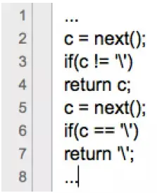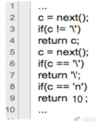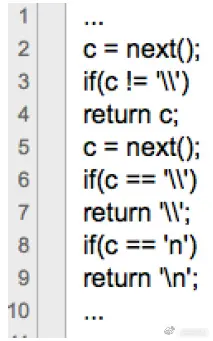其中,函数next()的功能是返回待处理文本(即被编译的源码文件)中的下一字符,强调一下是“单个字符”,并不是记法分析中的单词(即token)。