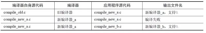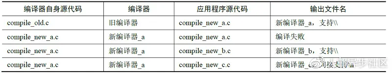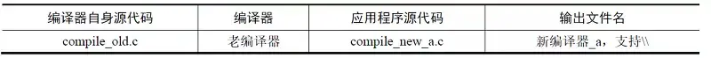 用旧编译器将新编译器的源代码compile_new_a.c编译,生成可执行文件,该文件就是新的编译器,我们取名为新编译器_a。为了方便理清它们的关系,将它们列入表0-1中。
