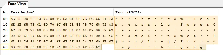 通过前面的例子,我们将数据序列化到data.txt文件中,下面我们通过二进制查看工具来看下Java序列化后的字节流是如何存储到文件中的,它的格式是怎么样的?我们将上面的SuperClass类改造下: