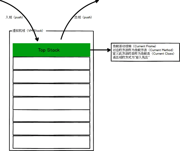 虚拟机栈描述的是java方法执行的内存模型:每个方法在执行的同时都会创建一个栈帧用于存储局部变量表、操作数栈、动态链接、方法出口等信息。每个方法从调用直至执行完成的过程,就对应着一个栈帧在虚拟机栈中入栈到出栈的过程。虚拟机栈是一个后入先出的数据结构,线程运行过程中,只有一个栈帧是处于活跃状态的,被称为"当前活动帧栈",当前活动帧栈始终是虚拟机栈的栈顶元素。