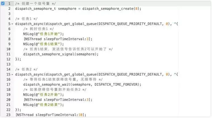 除了任务阻塞,还可以利用信号量实现这种阻塞效果:在异步开启任务 1 和任务 2 之前,初始化一个信号量并设置为 0,然后在任务 1 的 block 中写好请求操作,操作执行完后对前面的信号量加 1,在任务 2 的 block 中,需要在开始请求之前加上等待信号量的操作。这样一来,只有任务 1 中的请求执行完后,任务 2 等到了信号量加 1 才接着执行它的请求。例如下图。