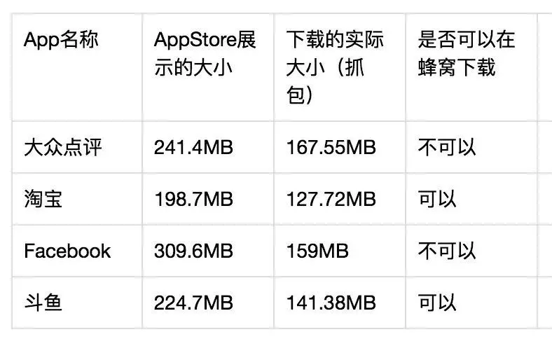 那么这个 150MB 指的是什么呢?是 AppStore 展示的 Size 么?我做了一个小小的调研,发现并非如此,150MB 是包的下载大小,而 AppStore 里展示的 Size 是安装后(有解压操作)的大小,对几个 App 进行了抓包操作:(这个是前段时间的调研,因为版本迭代可能数据会有出入,但足以说明问题)