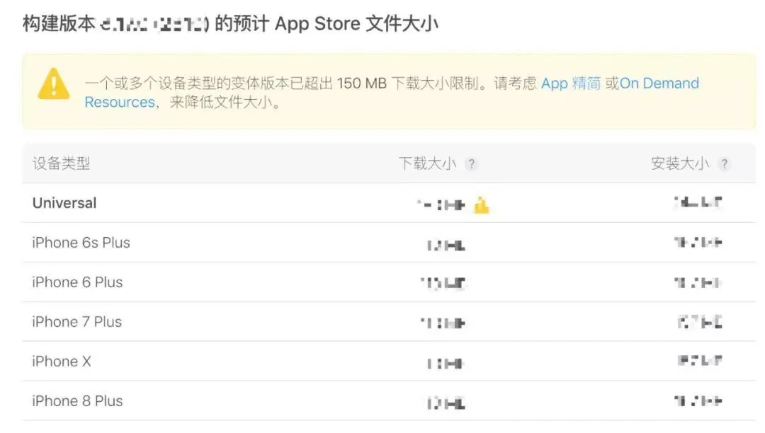 在 ITC 构建版本处理完成后,可以看到详细信息:在各个机型上的下载大小以及安装大小,同时也会提示你是 150MB 下载限制,超过限制还会给你一个黄色警告哦。