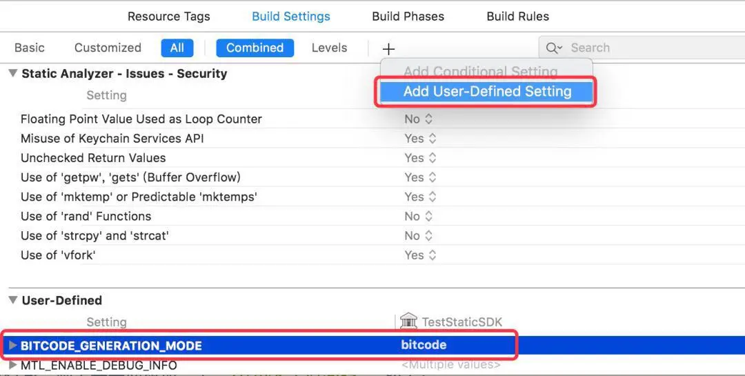 另外一种解决方案是,在静态库 Xcode 工程的 Build Settings 中,添加一个 "User-Define Setting",内容为:'BITCODE_GENERATION_MODE' => 'bitcode',如下图所示:
