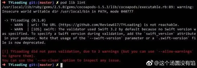 利用 cocoapods 建 swift 版本私有库步骤和 OC 版本一样,只要把语言 Objc 切换成 Swift 即可。一般情况下,pod lib lint验证会报警告,如下图,加 --allow-warnings 直接忽略即可。