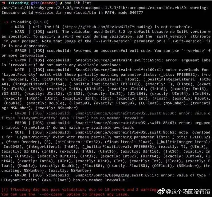 但是如果私有库里依赖了其他三方库,且该三方库的 swift 版本不一致,则 pod lib lint 会报一堆 error,如下图。