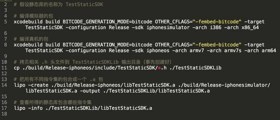 综上,为了通用,我们可以在 xcodebuild 命令后同时添加上述两种标识,因此一个完整的静态库打包脚本大致如下(同样适用于 Framework 的打包):
