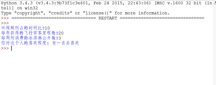 print("你对这个人的喜欢程度:",resultList[classifierResult - 1])
