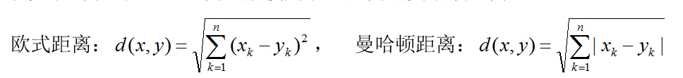 在KNN中,通过计算对象间距离来作为各个对象之间的非相似性指标,避免了对象之间的匹配问题,在这里距离一般使用欧氏距离或曼哈顿距离: