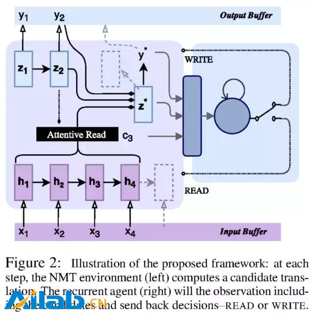 然而,这项研究的与众不同之处是它使用了神经机器翻译(NMT)框架(图2),能够「自动学习什么时候开始翻译词以及什么时候等待更多的输入。」