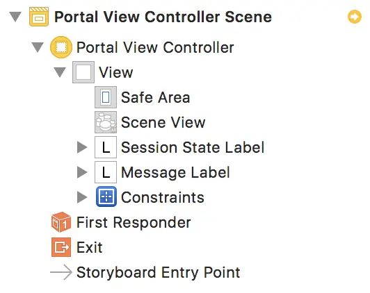 PortalViewController是应用启动后呈现给用户的界面.它包含一个ARSCNView来显示相机预览画面.还包含了两个UILabels来提供说明和反馈给用户.