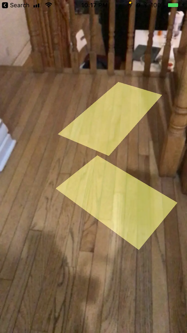 现在你可以成功地更新平面的位置了,运行一下app.你会看到平面的尺寸和位置会随着探测到新的特征点而调整.