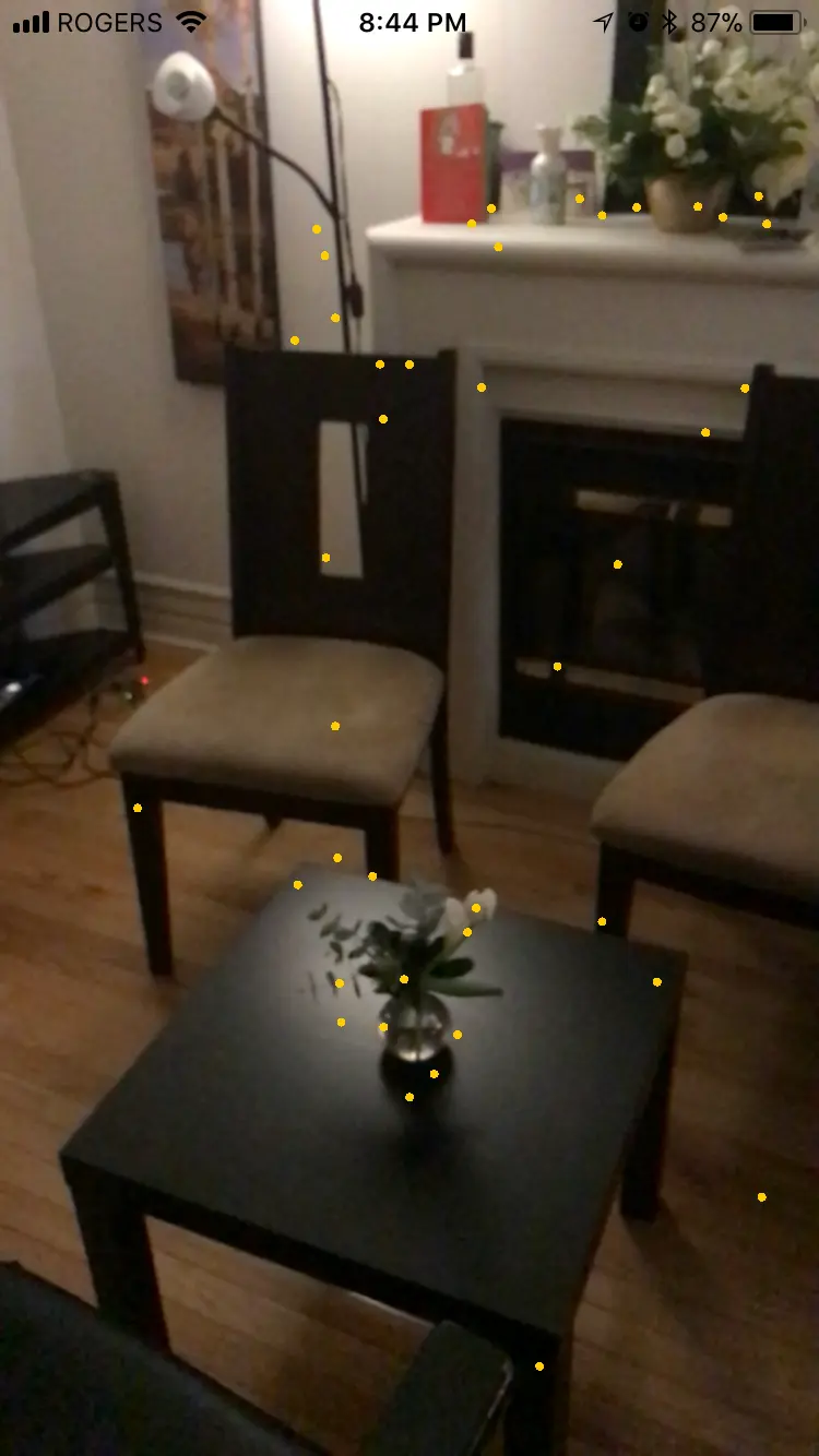 ARSCNView完成了繁重的相机视频捕捉和显示任务.因为是调试模式,你可以看到渲染出的特征点,它们形成了点云,显示出场景分析的中间结果.
