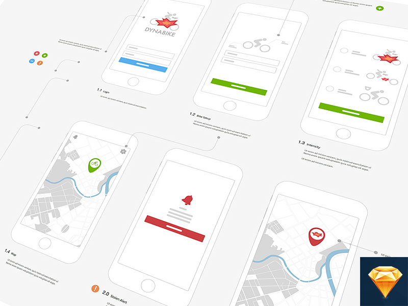 这里的例子是一个名为Dynabike的应用程序。设计师的初衷是设计一些可以供大家使用的例子。所以制作了这个可以用于iPhone 6/7演示的线框图案例。它带有一些基本的线条,按钮和框架。它有两个页面,一个用于Assets,另一个用于作为示例。