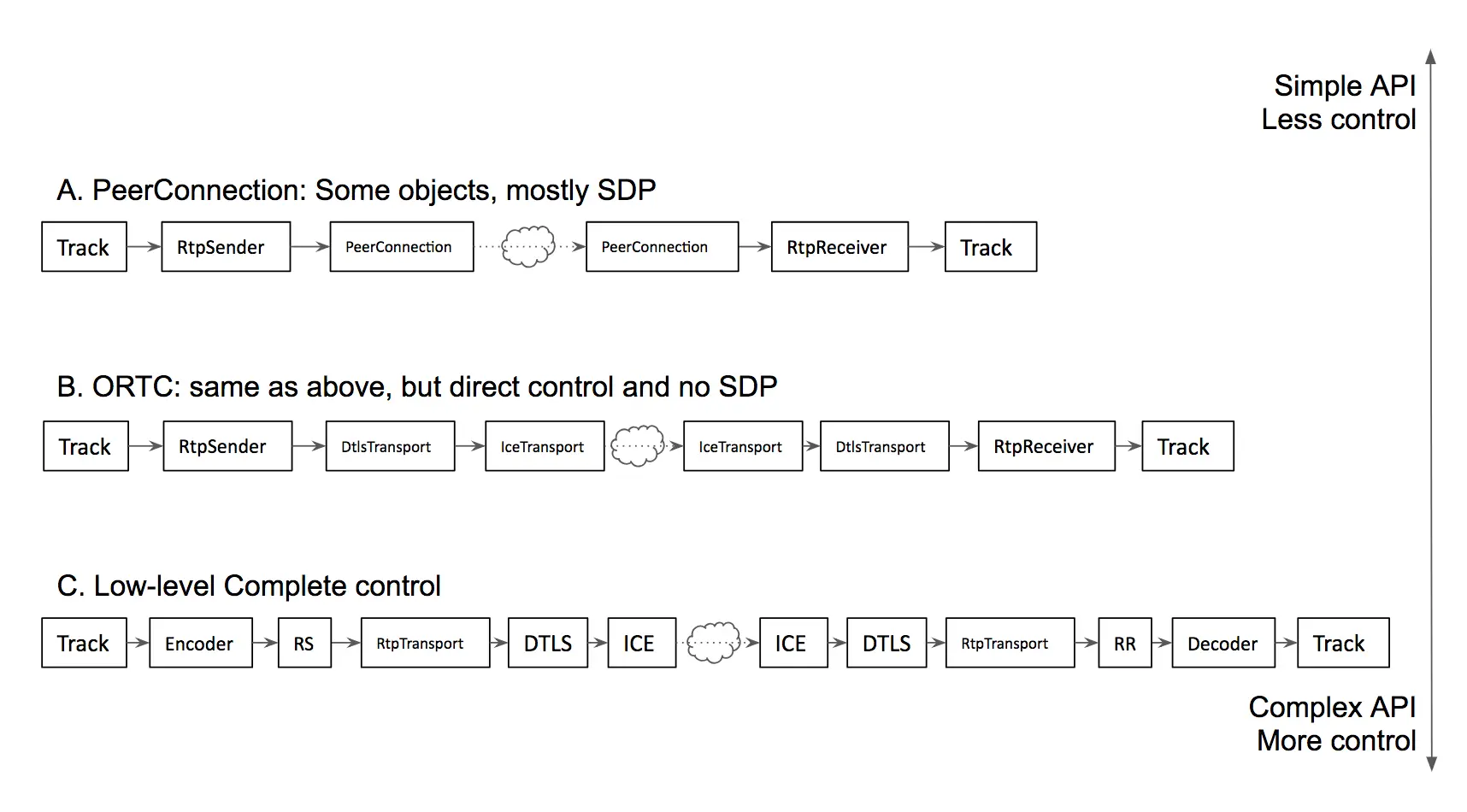 在 ORTC 中首次提出的几个对象被添加到WebRTC v1.0中。 ORTC 不使用 SDP 作为控制界面,开发者可直接控制媒体和数据传输通道,这一点与 WebRTC v1.0完全不同。更多对象可被直接控制。例如,使用 ORTC,您可以使用和控制可扩展的视频编解码器。