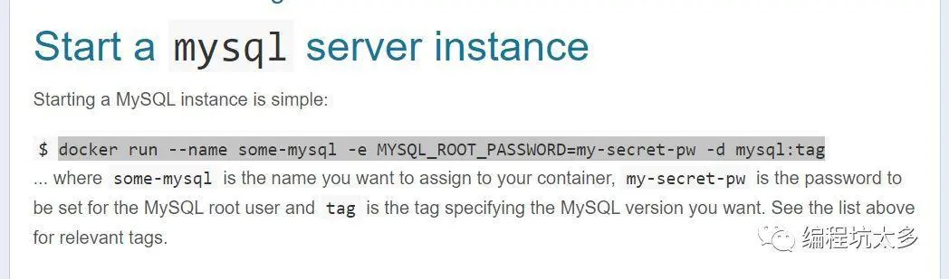 docker run --name some-mysql -e MYSQL_ROOT_PASSWORD=my-secret-pw -d mysql:tag