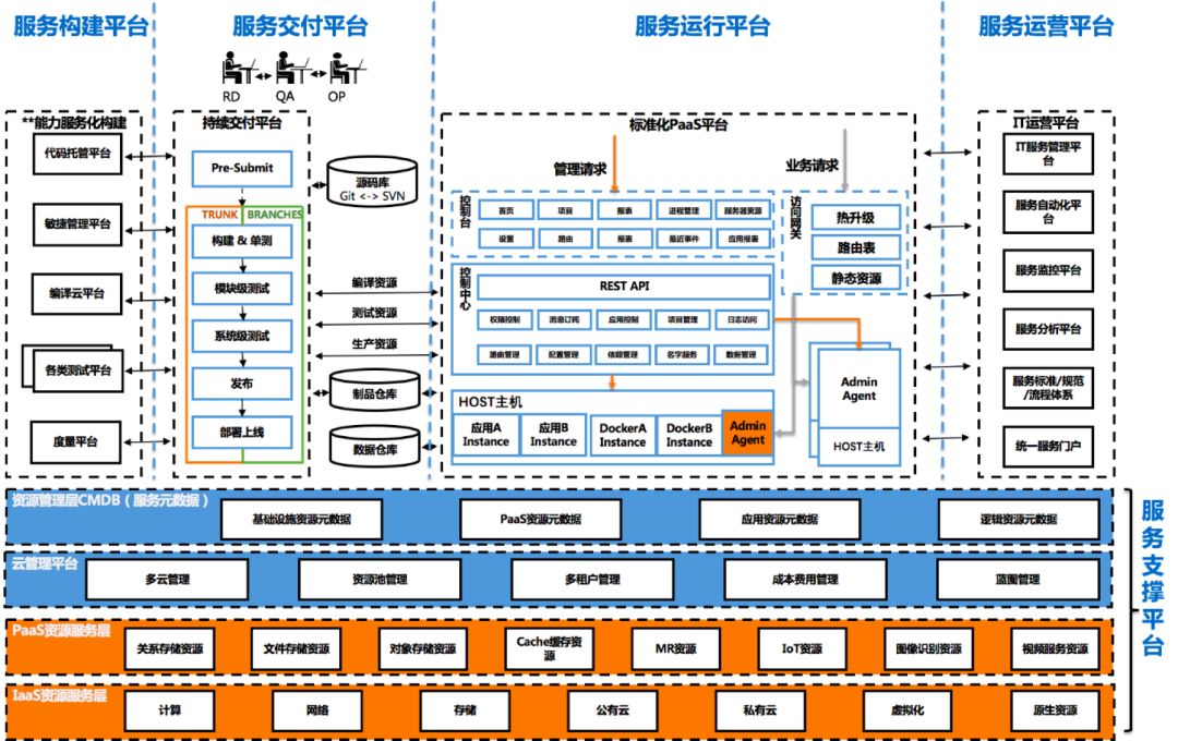 后面是我们的服务运行平台,我们运维部门涉及更多的比如我们的一些监控或者巡检、维护还有告警事件。服务运营平台,就是所谓的一些运营分析,比如我们的APM,比如我们的一些分布式链路监控,比如我们的一些统计分析平台。