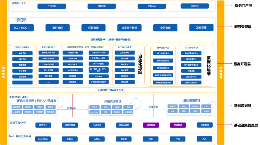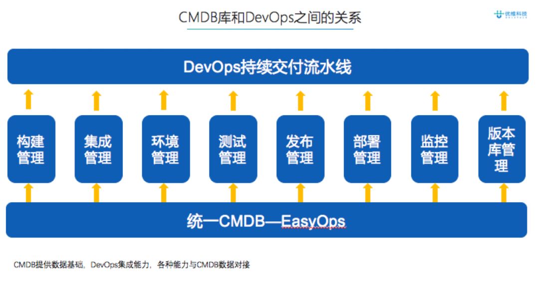 DevOps里面,我们CMDB它起到一个承上启下的过程,它往下就是我们的基础资源、基础设备层自动创建的能力,往上走就是我们运维平台的所谓的PaaS服务。运维的价值在于交付能力。要把自动化的能力最终可以形成按钮、平台直接可以交付给研发端的东西。