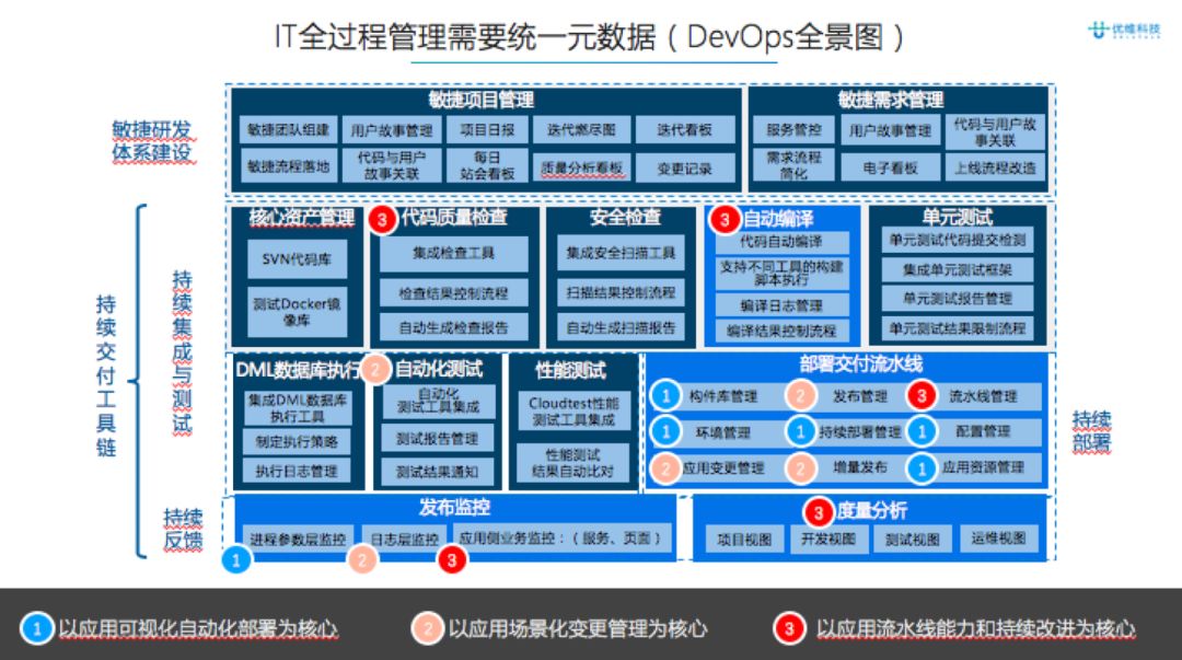 自动化部署包括一些容器等等。第二以应用场景化变更管理为核心的,比如一些日志分析、日志监控还有页面分析。第三是以应用流水线能力和持续改进为核心,这就是我们先做CD,我们再往上做一些OPS的持续反馈。