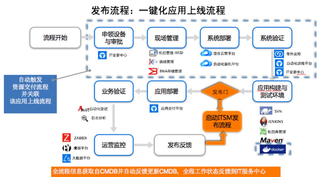 再往下走这个业务验证通过之后,CMDB获取到这个状态,那我监控平台可以往上做监控Agent部署了。这是我们非常标准的上线流程,完全可以做到一键自动化,比如一键扩容,容灾切换等场景。