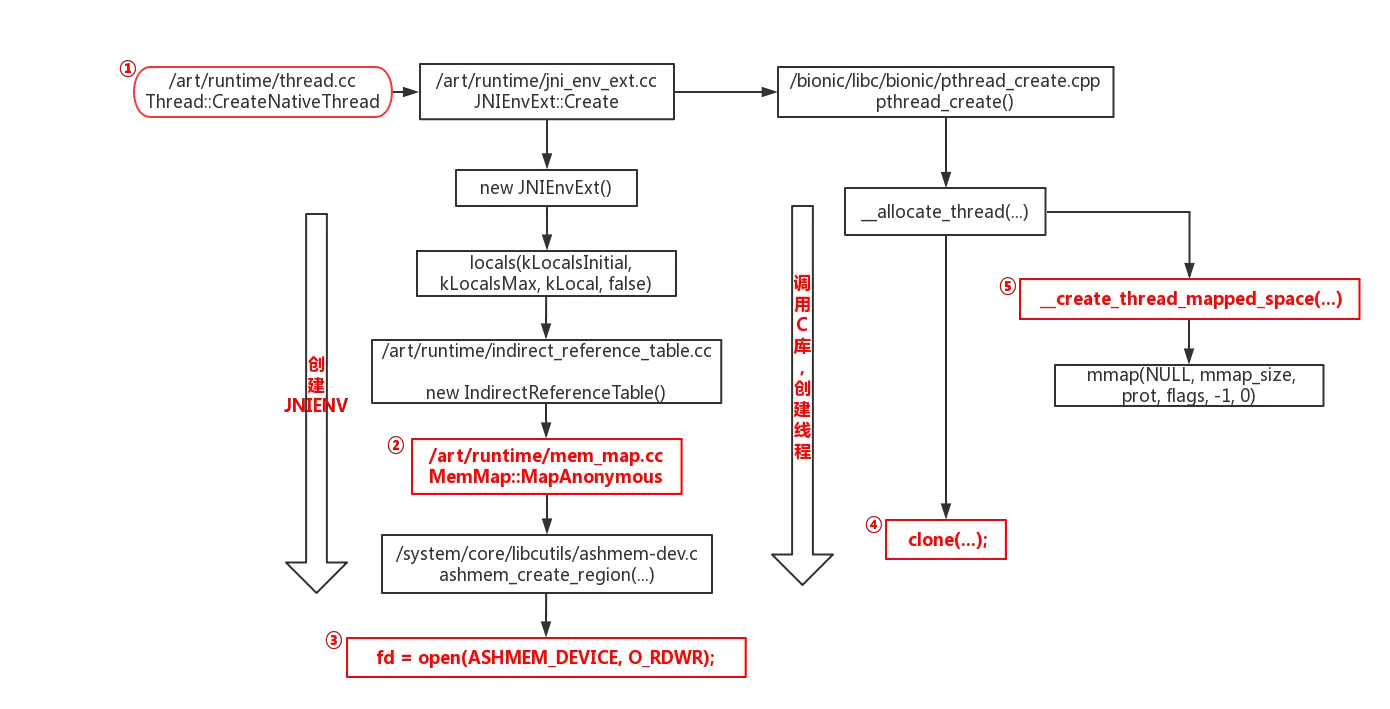 - 图中节点①, /art/runtime/thread.cc中的函数Thread:CreateNativeThread部分节选代码如下: