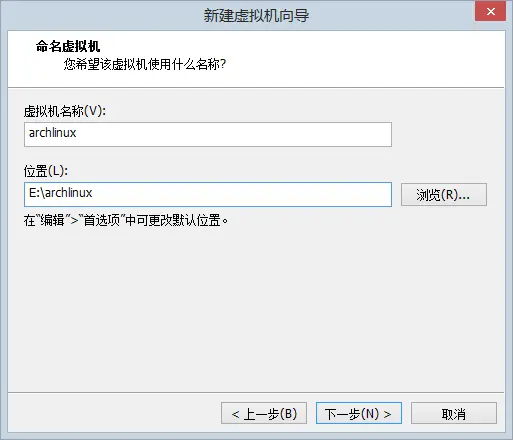 设置好你的虚拟机名称,和要把虚拟机安装到什么地方 我这里是e盘的archlinux目录