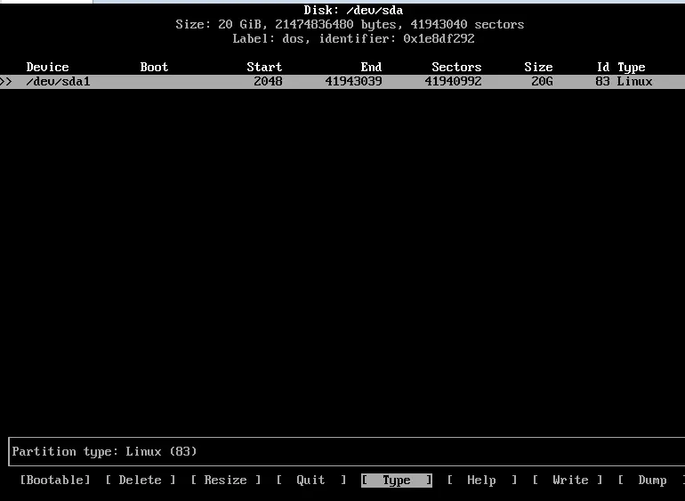 首先选中 磁盘 然后选new 然后会提示你想要输入的分区大小 我这里因为是虚拟机所以我全部20G都分出去了 然后选择type 类型是83.然后返回 再选bootable 然后 write 保存并退出