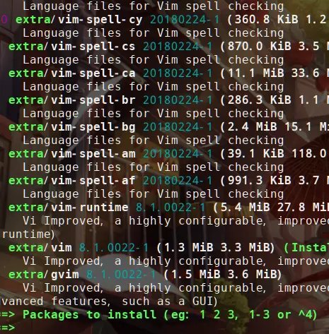 pacman -S yaypacman -S open-vm-tools (安装vmware-tools)其实到这里整个系统就已经装好了 需要何种包可以自己去找下 用 sudo pacman -Ss <pkgnanme> 就行 然后sudo pacman -S 选择你需要装的pkg(我这里程序包的简写)。