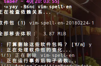 卸载软件包的方法和pacman类似 , 注意 -Rsnc是遍历系统上所有与此程序包的依赖关系,并全部移除 (包括程序的配置文件和相关信息),一般使用 -Rsc或者 -Rnc (只移除程序包本身,不移除其他依赖)