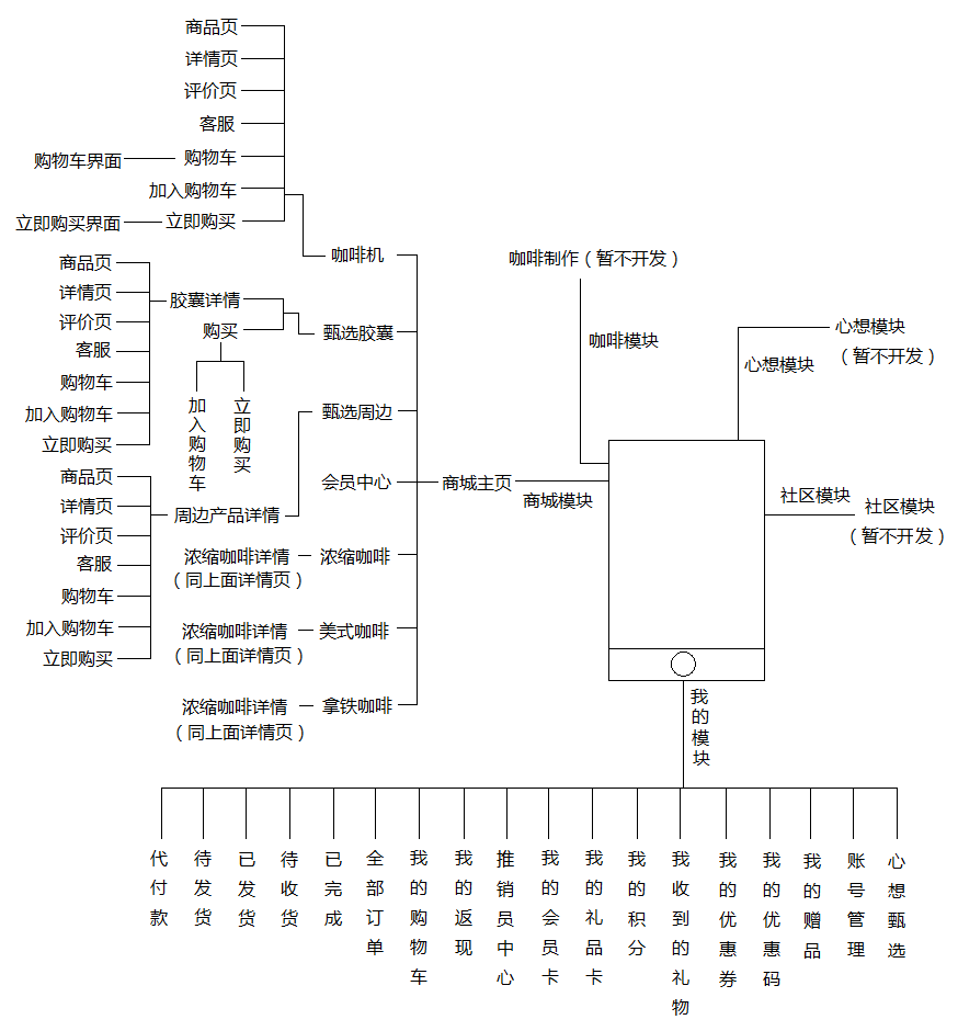 有些人看到下面的那张图肯定都懒得看了,其实让我看我也懒得看_(:з)∠)_,但是如 果你能认真的进行 分析需求 并且将其画出来之后,会对你之后的项目开发会有很大的帮助。下图是关于本项目中涉及到的一些需求,主要包括的是商城主页和我的模块。然后又分别在每个模块中有很多的细分,这里把商城这块做的比较详细(这里详细的意思就是把每个大体的业务里面进行更多的细分),而我的模块只是做了个大概,下面做个简单的分析。