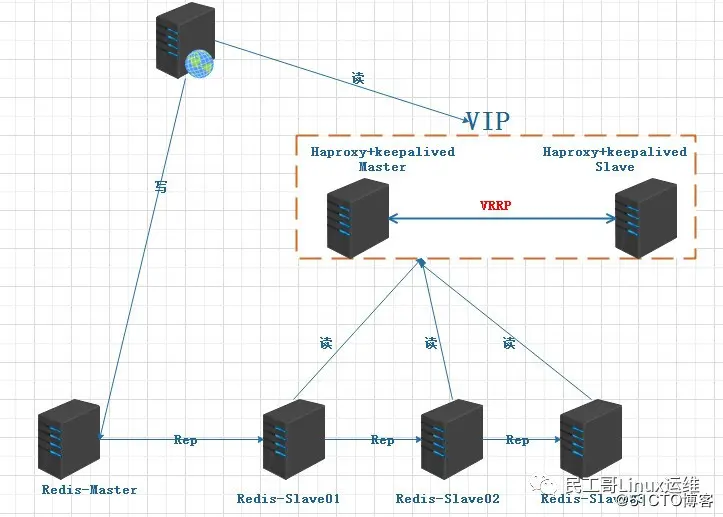 1)通过redis的配置文件,实现主从复制、读写分离 2)通过haproxy的配置,实现负载均衡,当从故障时也会及时从集群中T除 3)利用keepalived来实现负载的高可用