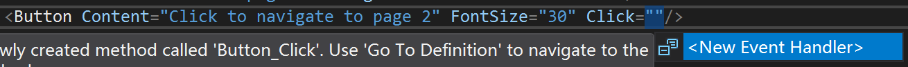 <Button Content="Click to navigate to page 2" FontSize="30" Click="Button_Click"/>按完回车后,vs 自动帮我们在对应的